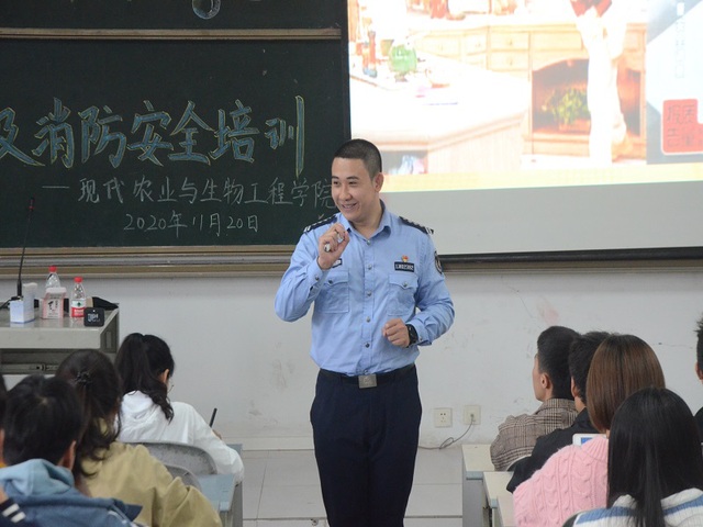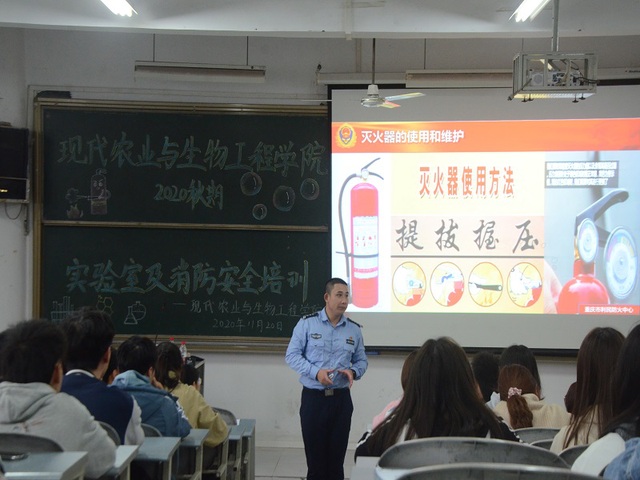 为预防我院学生在实验课程及日常生活中火灾事故的发生,同时贯彻以 “预防为主、防消结合”的消防方针,进一步提高大学生防火防灾的安全意识、消防安全知识,提高学生在火灾发生时自救和互救的能力,2020年11月20日下午14:00整,现代农业与生物工程于格律楼03教室开展了实验室及消防安全培训。此次培训会由学生工作办公室主任(团委书记)李吉老师主持,重庆利民防火中心的郑教官进行演讲,各班级代表以及学生会组织人员参与本次活动。