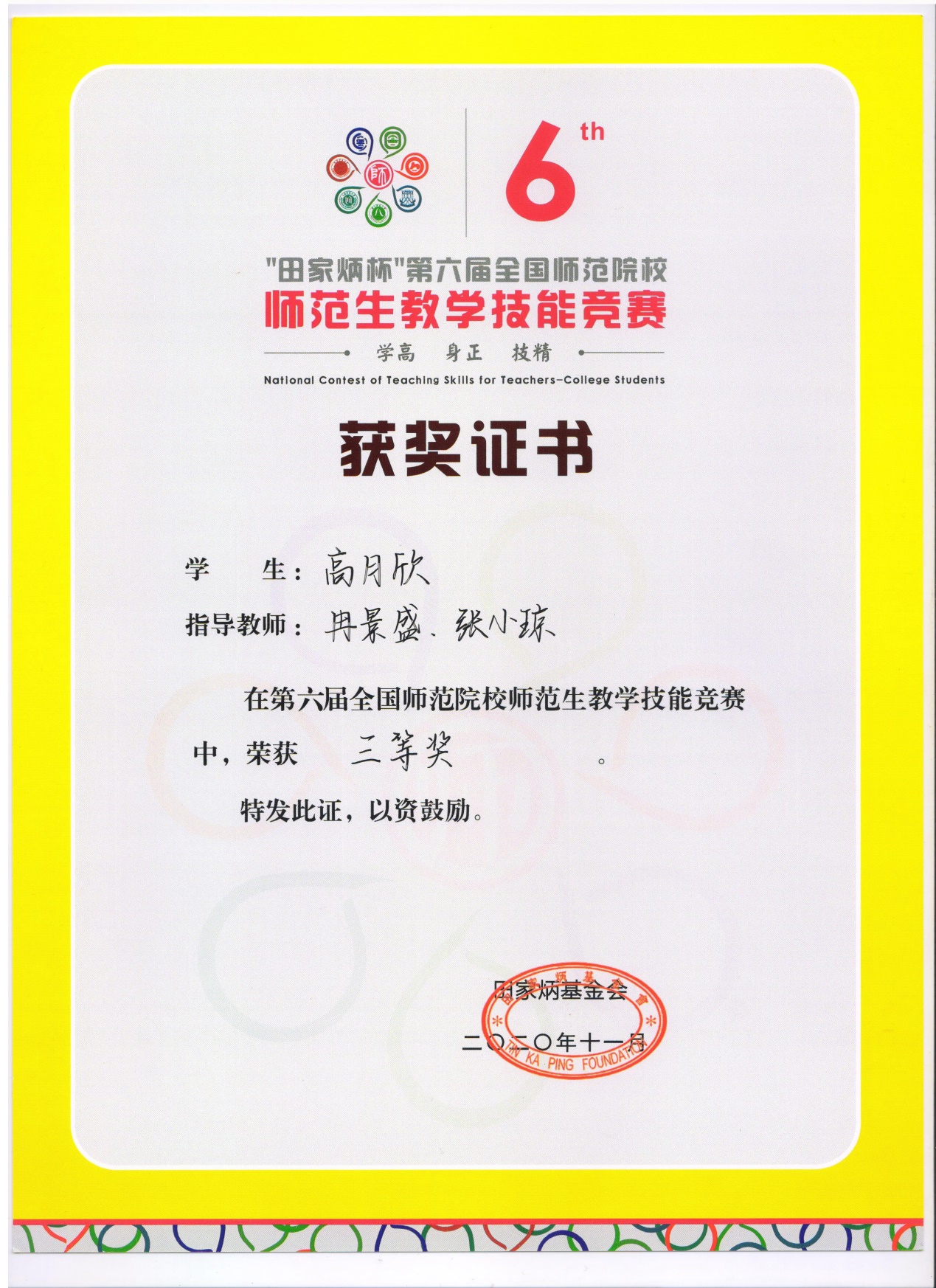 我院生物科学2017级高月欣同学在第六届“田家炳杯”全国师范院校师范生教学技能大赛获得三等奖。