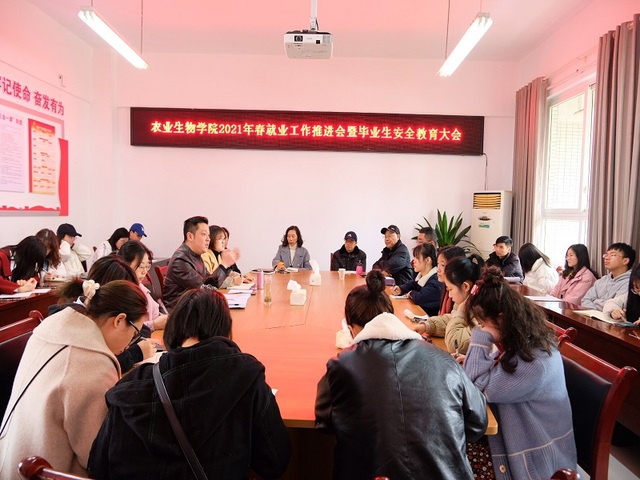 为了促进毕业生顺利就业,同时为了让他们了解相关政策,现代农业与生物工程学院于2021年3月5日在格律楼3416会议室召开了现代农业与生物工程学院2021年春就业工作推进会暨毕业生安全教育大会。此次会议有张敏书记、汪建华院长、李昌满院长、韩宗先院长、王殿东主任、李吉老师、吴林蔓老师、谢波老师以及党员、学生骨干参与。