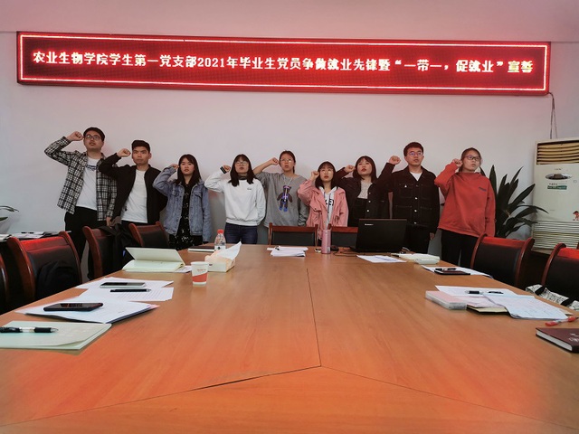 为充分发挥毕业生党员的先锋模范作用,2021年4月24日下午18:00,现代农业与生物工程学院学生第一党支部于格律楼3416顺利开展了2021年毕业生党员争做就业先锋暨“一带一,促就业”宣誓活动,支部书记吴林蔓老师为本次活动的主讲人,一支部全体党员参与了此次活动。