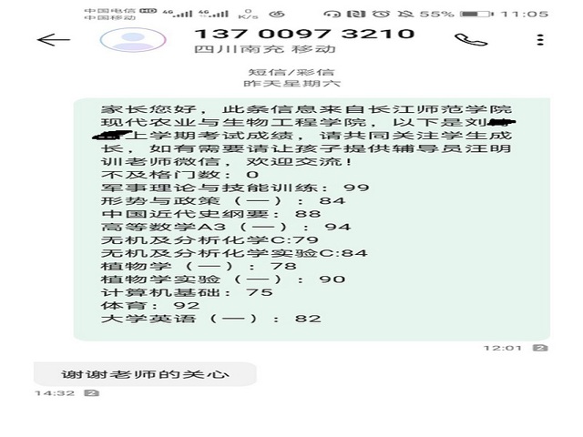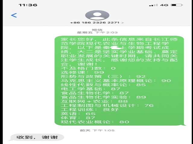 教师与家长的关系是一种重要的教育资源,双方的良好的合作、互动能够开发这一教育资源。双方良好的合作能够增进师生、家长对学生的了解。相对于家长老师更了解学生在学校的学习情况、身体情况、心情变化等细节。反之,家长更了解学生在家学习状况与生活情况,因此家校联络这种教育方式就显得无比重要。经院领导再三商讨过后决定将现代农业与生物工程学院全体学生的期末成绩以信息的形式发送到各位同学的家长手中。希望通过家校联络的方式尽量减少学生对家长报喜不报忧的情况,减少学生独自承受的压力与迷茫。