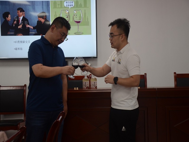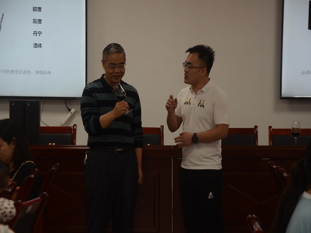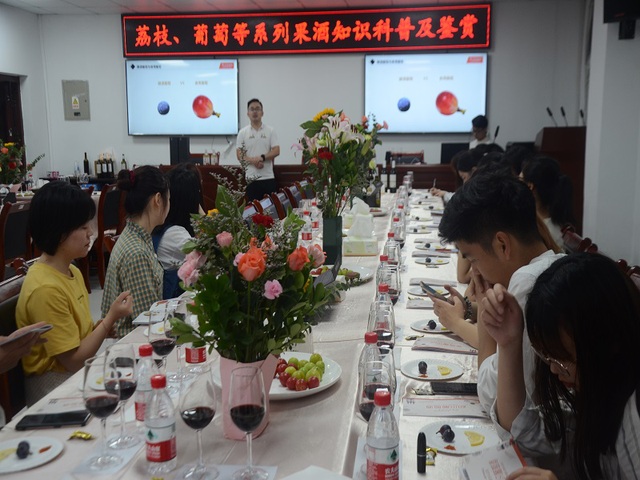 活动准备前夕,工作人员将活动现场布置得十分有情调,每一处摆盘和摆花都大有讲究。伴随着参会人员的入座,活动正式开始,主讲人以生动有趣的语言给广大师生和社会人士讲解了关于酿造葡萄酒的一些方法和小知识,纠正了一些人们对于酿造葡萄酒的惯性误区,由此激起了大家对酿造葡萄酒的浓厚兴趣,让大家带着好奇心继续听下去。在科普知识的同时,也穿插了一些品酒的实际操作,主讲人教大家持杯和敬酒的相关礼仪,并且邀请了老师和学生上台进行实际操作,增加了讲座的趣味性。紧接着,主讲人讲解了葡萄酒的品鉴步骤,“观色-闻香-尝味”三个步骤便能很好的品味美酒。然后,主讲人宣布本次葡萄酒知识科普讲座就到此结束,全体师生和社会人士开始了悠闲的品酒环节。
