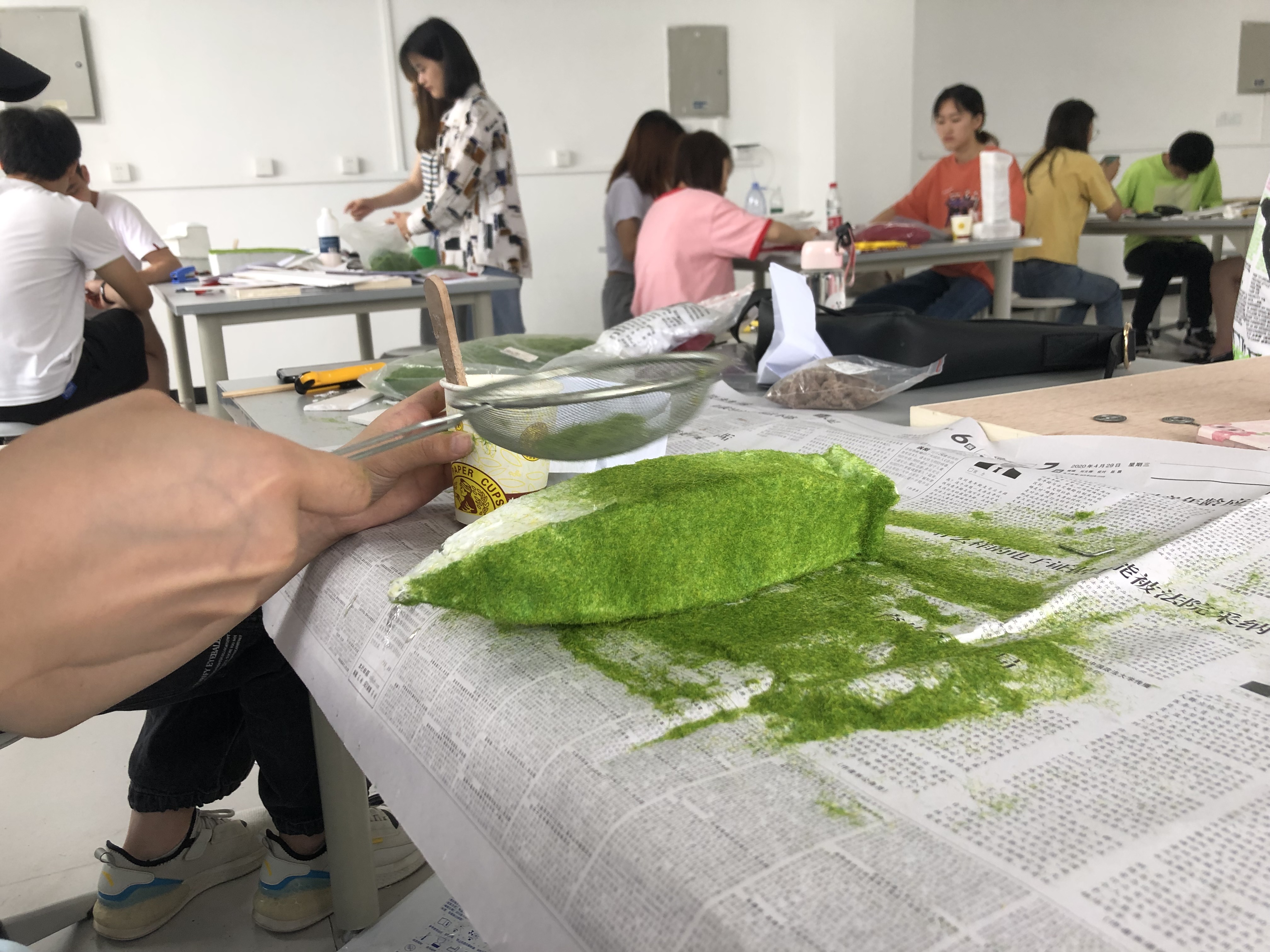 实践周伊始,宋老师与刘老师分别介绍了本次实践周所要学习与实践的学习内容,以及安排了我们这周内的实践任务。本次的主题立体花坛设计是围绕“中国”展开的花坛设计,分别从建党、建军、建国、十一届三中全会、中国梦、建党一百周年6个主题进行花坛设计与制作。随后,依次由6个小组上台进行本次实践周作品构思设计的PPT汇报。当天汇报结束后同学们都开始进行材料准备,以及制作构思。接下来的几天里,同学们分别通过制作铁丝骨架,加固骨架,缠绕纱布,通过配合胶水撒上草粉完成主体的立体花坛构成。最后,同学们在按照构思好的设计图纸完成了立体花坛的全部制作。在此次实践周中,同学们也遇到了许多困难,在同学们之间相互配合以及两位老师的细心指导下,完成了本次的实践周。