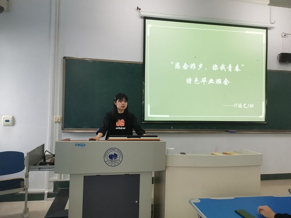 首先,由纪律委员点名,大家站起来齐唱班歌。然后,主持人向同学们说明了本次主题班会的目的与内容,让同学们对本次活动有基本了解,并给同学们提出了本次活动的纪律要求。接着,邀请辅导员何思源老师和班导李文博老师致辞,同学们在老师们的祝福中饱感不舍。紧接着,同学们一起观看班委所制的视频,追忆往昔。看完后,同学们开始畅所欲言。一位同学表示,大学是个小社会,四年的生活让他从幼稚渐渐成熟,知道学习的重要性,知道了“责任”二字的重要性,知道了如何与他人相处。最后,主持人总结了本次活动,她提出,虽然我们已身为毕业生,但仍需保持初心,努力拼搏,自己的未来自己创造,自己的历史自己书写。至此,本次特色班会圆满结束。