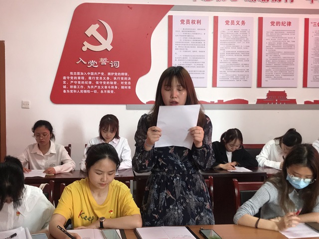 本次会议第一项议程,由发展对象汇报有关情况。会议伊始,支部党员大会选出了谢蓉同志作为监票人,李圳师同志作为计票人,接着由吴倩、徐小清、聂源瑶、程珊四名同志分别汇报对党的认识等有关情况,从她们的汇报中,可以强烈感受到她们对中国共产党的向往。会议第二项议程由各自的入党介绍人分别介绍发展对象的有关情况。会议第三项议程是支委会报告对发展对象的审查情况。会议第四项议程是与会党员发表意见,对发展对象能否入党进行充分讨论,然后由发展对象表明自己的态度和决心。最后一项议程由党员同志们进行无记名投票表决。通过投票,大会同意吴倩、徐小清、聂源瑶、程珊四名同志加入共产党,成为光荣的共产党员。