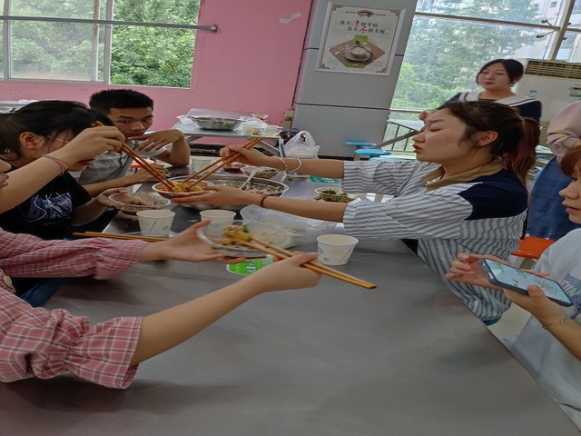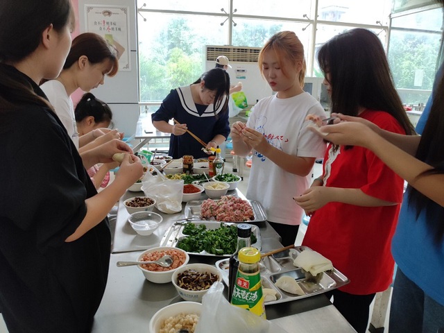活动开始,由纪律委员开始点名,随后由文体委员领唱班歌。紧接着,大家按照班委安排好的任务去操作,有的同学负责洗菜,有的同学负责切菜,还有的同学负责处理肉馅,剩下一部分同学在旁边做凉菜。在准备工作处理完毕后,大家围成一圈开始包饺子。一阵辛苦的劳作过后,一排排饺子整齐的放在餐盘里,由班委带到指定厨房委托食堂工作人员进行烹饪。热腾腾的饺子端到二楼,大家坐在一起,开始吃饺子,就好像一家人一样,分别端着自己调好的酱料,享受着劳动的果实。