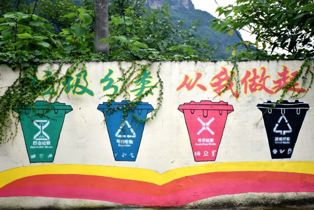 考察途中,也能在该村多处墙壁上看到有关“垃圾分类”的宣传涂鸦与标语,可见该村在积极响应国家政策建设“文明乡村”。