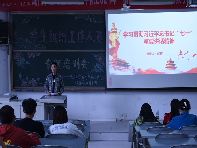 为了让同学们深刻认识、准确把握习近平总书记“七一”重要讲话的重大意义和重要讲话精神的内容实质,将习近平总书记“七一”重要讲话精神融入学生会工作,2021年10月8日中午12:10,现代农业与生物工程学院在格律楼03阶梯教室开展学习贯彻习近平总书记“七一”重要讲话精神。此次会议由学生会执行主席赵旺进行宣讲,现代农业与生物工程学院学生会全体工作人员参加。