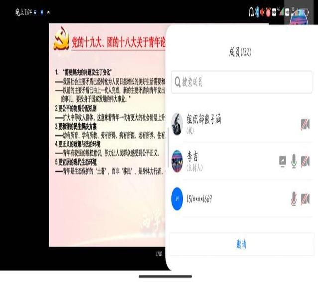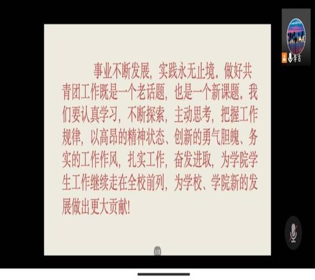 活动伊始组织部的同学在群里通知学员们培训会的时间、老师所用的会议软件及相关注意事项。随后,待成员全部到齐后李吉老师开始了教学。教学主要围绕着对党的十九大、团的十八大关于青年的论述以及对新时代的青年提出的要求并加强其意识、提高本领。其中,李吉老师特别嘱咐要在实践中履行使命担当,增本领长才干。让学员们深刻懂得青年一代有理想有担当,国家就有前途民族就有希望的道理。在教学尾声来临之际,李吉老师再一次强调了新时代共青团的意义并寄语学员们以深切厚望。至此,第一期培训圆满结束。