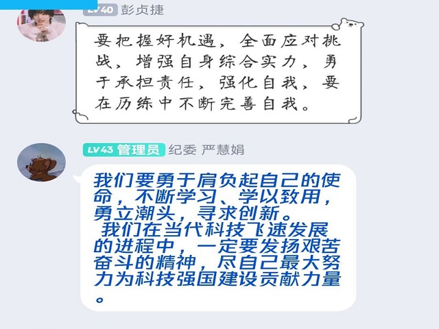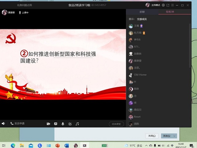 本次线上会议,各班采用了不同的方式进行:QQ电话,腾讯会议等。会议伊始,由纪委进行线上点名,确认班级同学是否到齐。然后全体同学开启麦克风,由团支书带领同学们齐唱团歌。唱完团歌后,主讲人介绍了此次团组织生活会的开展目的以及背景等。随后,各班就本次会议的主题提出了问题与讨论,例如:“分享自己知道的科研榜样的故事。”“谈谈自己对科研精神的理解。”“我国有哪些你知道或了解的科研工作者?”等几个问题,同学们进行了激烈的讨论。