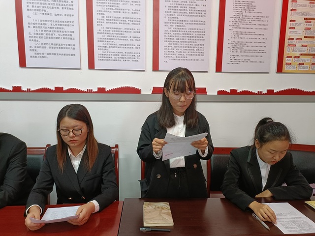 本次会议第一项议程,由发展对象汇报有关情况。会议伊始,支部党员大会选出了李姿仪同志作为监票人,龚彭陵同志作为计票人,接着由唐孟琪、张川雨、秦丽、吴炜四名同志分别汇报对党的认识等有关情况,四名同志依次表明了入党动机和她们要加入中国共产党的强烈愿望。每位发展对象发言之后,各对应入党介绍人对其进行学习、工作、实践活动等方面进行评价。其次,由支委会报告对发展对象的审查情况,再由与会党员对发展对象能否入党进行充分讨论并发表各自的意见,然后由发展对象表明自己的态度和决心。最后一项议程由拥有表决权的党员对接收预备党员进行无记名投票表决。通过投票,大会同意唐孟琪、张川雨、秦丽、吴炜四名同志加入中国共产党,成为光荣的中国共产党预备党员。