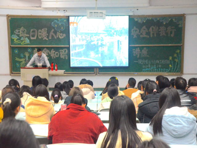为宣传学习并贯彻我国“预防为主,防消结合”的消防工作的基本方针和基础法规,让同学们了解消防与安全用电常识,学习火灾预防与扑救技能,提高安全意识,现代农业与生物工程学院于2021年11月24日19:00在正心楼02阶梯教室准时开展了“冬日暖人心,安全伴我行”安全知识讲座,此次会议由辅导员谢波老师主讲,2020级、2021级所有室长参加