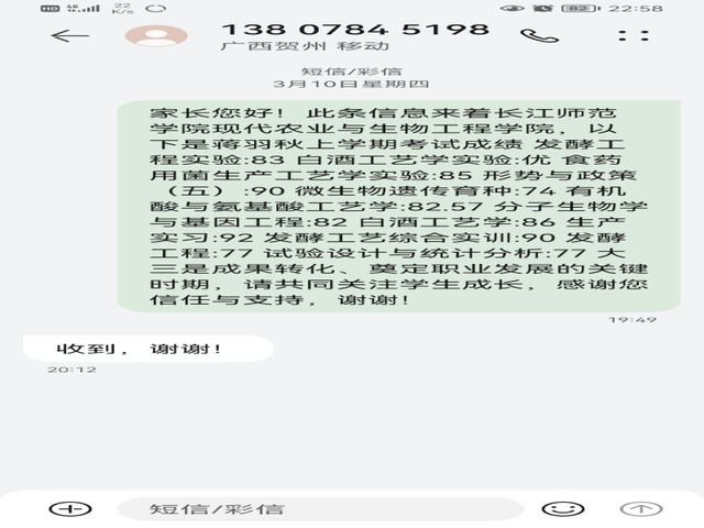 家校合作意义重大。为了切实对学生学习的引导、提高家长的教育素养和家庭教育的水平,长江师范学院现代农业与生物工程学院于2022年3月9日到3月16日开展了以“家校携手,共促成长”为主题的工作推进会。将学生的期末考试成绩以信息的形式发送给该生家长是学院每学期开学初都在坚持做的工作。此次推进会由谢波老师对接,现代农业与生物工程学院学生会组织,各宣传委员全程参与的工作。