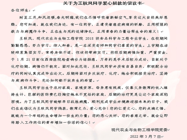 病魔无情、人间有爱,接力爱心,传递希望。今年1月21日,我院2018级食品科学与工程专业的王秋凤同学在西南医院检查确诊为结肠癌,这个消息给了正值青春年华、正在为了梦想努力奋斗的王同学和她仅靠父母的微薄收入支撑兄妹上学的家庭一个沉重打击,面对高昂的手术费,一家人实在无能为力。得知此消息,学院党委高度重视,第一时间组织动员,及时送上学院关怀。