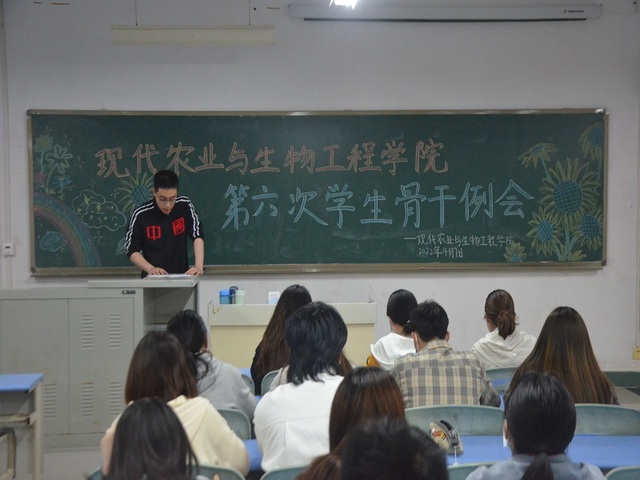 为总结上周工作,更好地管理班级,合理地建设学院,现代农业与生物工程学院于2022年4月7日下午18:10在正心楼210教室开展了第六次学生组织工作例会,此次例会由2020级辅导员汪明训老师主讲,组织部部长杨琼衣主持,全体学生骨干参加。