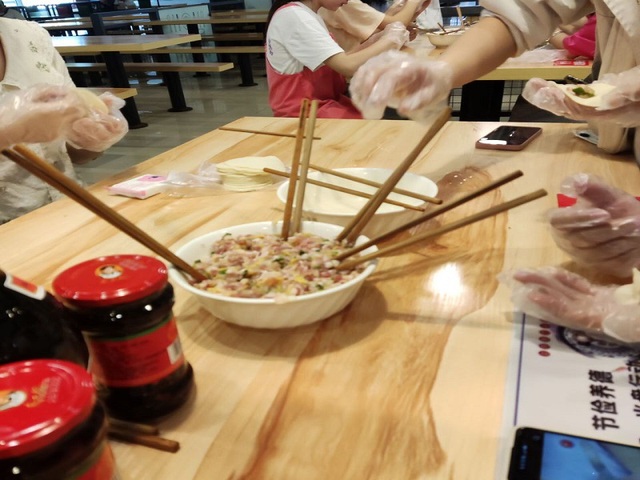 活动开始前,由各班委组织采购食材,并在北苑食堂一楼提前进行加工处理,事毕,同学们陆续赶来。活动伊始,由纪委刘倬宇进行点名,一人缺勤。其次是由文体委员田嘉钦组织同学们合唱班歌《奔跑》。接着,由班长郑智慧同学给同学们讲解活动相关事宜及活动流程,并由团支书汪娟同学给同学们介绍粮食安全的重要性,并介绍了袁隆平爷爷的先进事迹。而后由同学们自由进行分组,在同学们充满欢声笑语的相互合作中开展包饺子活动。虽然同学们包饺子的手法略显生疏,饺子形状各异,但这是同学们辛勤努力后的结果,在食堂阿姨的帮助下,同学们终于吃上了自己亲手包的饺子,至此此次特色班会在班长郑智慧同学的总结中宣告圆满结束。