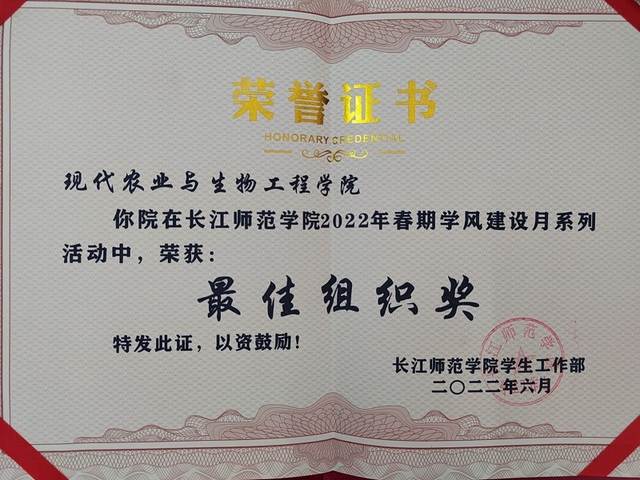 在老师们与同学们的共同努力下,本次“学风建设月”主题活动取得圆满成功。并且在长江师范学院学生工作部(处)6月10日发布的关于2022年学风建设月系列活动评选中获得了“优秀组织奖”