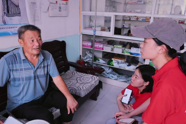 当服务团来到村医疗室,一位老人刚输完液坐在长椅上休息。据了解,老人患有气管炎,需长期输液才能抑制住病情。据老人讲述,自己身患糖尿病、高血压等多种疾病,需要长期吃药。在了解到老人的基本情况后,队员们就日常饮食的问题为老人讲述了“科学减糖,健康生活”的相关知识,建议老人平时要少吃含糖量高的食物,吃清淡类的食物,每天可以米面作为主食,但不要煮成粥或面糊这种升糖指数高的形式。在交谈中,队员们得知老人的儿子儿媳常年在贵州工作,而孙女在外读大学。平日里,老人就与老伴独自生活。老人讲,松柏村就只有这一个医疗服务点,离家有一定的距离,但相比之前到镇上去看病要方便很多。