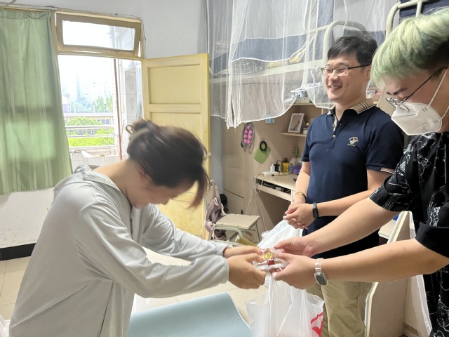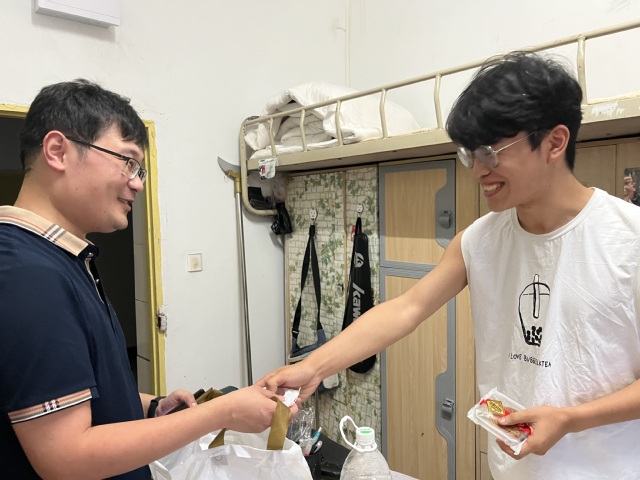 活动伊始,各位老师依次组队前往本年纪学生宿舍。到达学生宿舍后,各位老师与留校学生热情交谈,询问学生近期学习与生活状况,也鼓励学生保持良好的身体与心理状态,建议同学们利用课余时间积极进行体育锻炼,并检查学生宿舍环境,力争减少安全隐患。而后,各位老师将精心准备的月饼交于学生并送上节日祝福。同学们躬身接过老师的礼物并表达感谢,现场气氛一片温暖和谐。最后,各位老师与同学们合影留恋,记录温馨时刻。