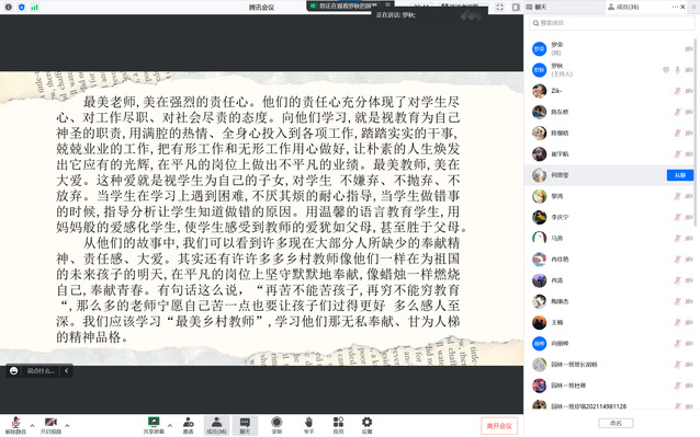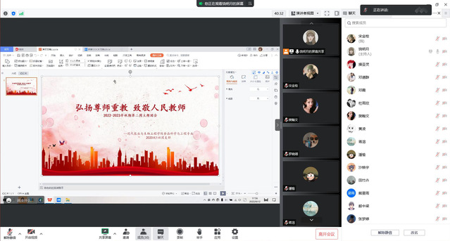 会议伊始,由各班纪检会员点名,确定到场人数。随后,全体学生起立,在文体委员的带领下合唱团歌。接着,各班主持人向同学们介绍此次团会的主题背景和开展目的,同时结合教师节成立的历史背景出发,向同学们提出“你所了解的美丽教师及事迹有哪些”“我们从他们身上可以学到哪些精神”等问题。然后,各班同学就这些问题展开激烈讨论并举手发言。紧接着,各班主持人向同学们展示优秀教师的相关图文,使同学们深入了解相关事迹,深刻感受教师们的责任意识与奉献精神。最后,由其他同学和班委进行书籍推荐以及有关事务的传达。