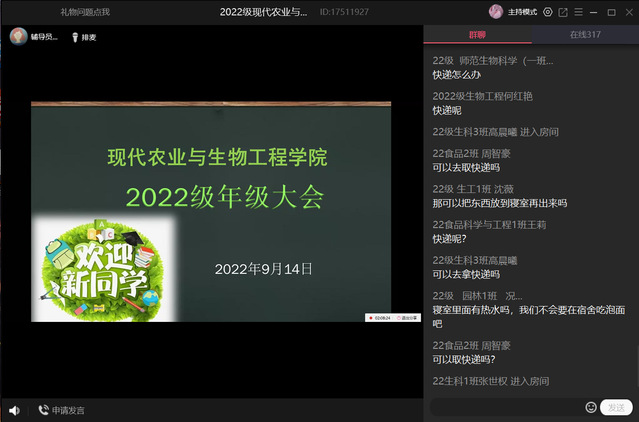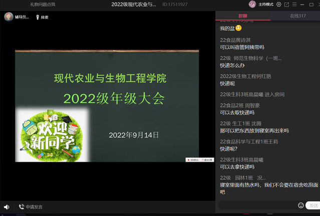 为强调疫情防控,组织安排新生开学事宜,解决新生困惑问题。现代农业与生物工程学院于2022年9月14日晚上9点开展线上年级大会。此次大会由2022级辅导员胡代芳老师主讲,2022级全体新生参与。