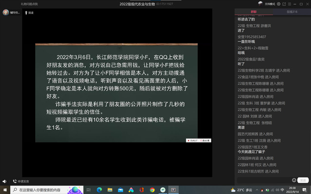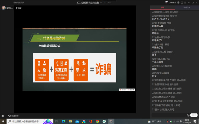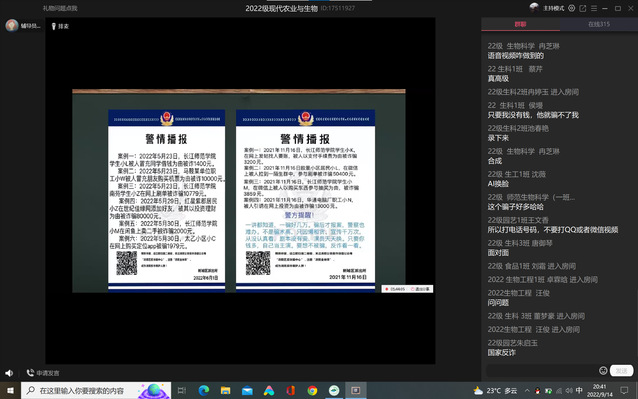 为增强学生警惕性和主动防范意识,进一步督促学生妥善保管个人金融信息,养成良好的金融消费习惯,长江师范学院现代农业与生物工程学院于2022年9月14日利用即时通讯设备组织开展网络安全宣讲活动。此次活动由辅导员胡代芳老师主持,2022级全体新生参加。