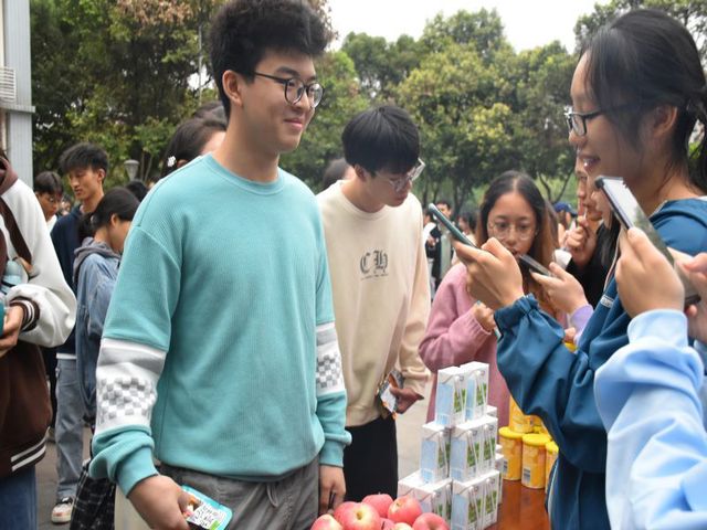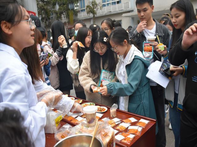 此次活动有三大环节:(1)所有学生凭券入场,领取一张点赞小贴纸,学生可凭券领取一份食品品尝;(2)试吃完食品后把手中的点赞小贴纸投给中意的食品,点赞小贴纸也可换取一些食品;(3)此次活动准备了一个有关于二十大和营养健康相关的知识竞答环节,参与后答对问题会有相应的奖品,答错的话可重新排队参与,奖品近两百份,先到先得;环节(1)与(3)不分先后顺序,可以随意选择。精心制作美食的同学们为此次活动准备已久,以相当热情的态度迎接同学们到来,为同学们介绍自己摊位上的食品,食品种类繁多,外观惊艳,品尝起来美味醇香。现场排队品尝美食的全校师生也积极回应同学们的热情招待,用手中的美食券换取自己想要的美食。最受欢迎的是奶茶摊位,仅仅不到半个小时便被同学们一扫而空,不少同学高兴地向朋友们展示着自己手中的奶茶,答题摊位和酸奶摊位前也排起了长龙。