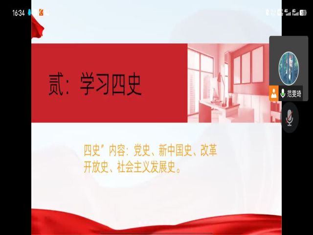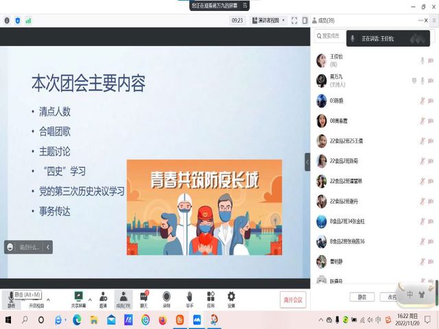 团会开始,同学们合唱团歌。合唱结束后,主持人发表对疫情的见解,赞美当代青年作为时代重任的逆行者主动担当大任,敢于挺身而出,充分发挥青年生力军和突击队的先锋模范作用和保持“越是艰险越向前”的英雄斗志。不管身处何方,不管从事何种工作,全国人民都朝着防控疫情的中心点发力施策,凝结成一道道靓丽的风景线,为防疫抗疫凝聚斗志、增强信心、温暖人心。其后,主持人发起提问:“身为在校学生,我们可以做些什么?”同学们对此进行积极讨论并主动分享自己的看法,大多都是围绕着疫情防控做好“落实”文章。之后,团会进行第二项——“四史”学习。“四史”,即党史、新中国史、改革开放史、社会主义发展史。讲解“四史”的内涵后,主持人发起提问:“我们可以从‘四史’中学到什么?”同学们积极发表自己的见解,并对“四史”教育的内容和意义进行了高度肯定和赞扬。团会进行第三项,党的第三个历史决议学习,主持人提出:整体看《决议》有两个特点,第一个特点是主要总结党的百年奋斗重大成就和历史经验;第二个特点是突出中国特色社会主义新时代这个重点,用较大篇幅总结党的十八大以来的原创性思想、变革性实践、突破性进展和标志性成果。