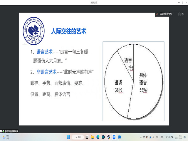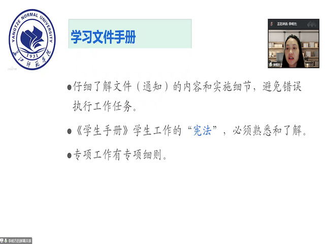 本次青马工程培训会分三期举行,分别由2020级辅导员汪明训老师、2019级辅导员吴林蔓老师和2021级辅导员李明方老师主讲。14日晚7:00的培训会由汪明训老师主讲,培训主题为学生事务日常管理。汪老师在培训会上分四点讲述学生事务管理:奖贷体系、学生行课、宿舍管理和签到请假。汪老师强调学生骨干是协助辅导员开展学生工作的重要力量,相当于半个辅导员半个学生。在对学生事务管理的认知上,要认识认识更高、更深,学会站在学校的立场上思考学生问题。