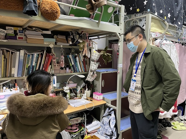 活动伊始,老师与部分学生骨干在北苑食堂集合。随后,各年级辅导员老师到相应年级的寝室走访排查。本次排查内容有:违规电器、饲养宠物、私接电源,存放管制刀具酒瓶、吸烟及清洁卫生问题。辅导员们进入寝室,检查了同学的电器使用情况,和同学们讲了用电安全的注意事项,提醒同学们杜绝使用违规电器。此外,老师们还强调了卫生问题:疫情下,同学们更应该注意个人、寝室卫生。同学们积极配合辅导员的检查,认真的听取了辅导员的建议。同时老师们也了解了学生在寝室的学习和生活情况,并与同学们做了进一步交流。至此本次活动圆满结束。