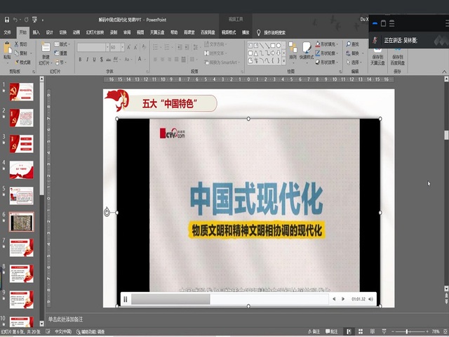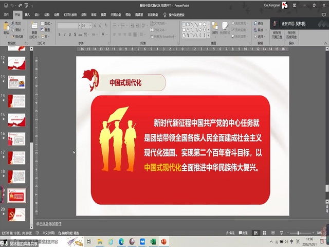 吴林蔓老师首先对中国式现代化进行了全面的阐述,习近平总书记深刻指明中国式现代化是人口规模巨大的现代化、是全体人民共同富裕的现代化、是物质文明和精神文明相协调的现代化、是人与自然和谐共生的现代化、是走和平发展道路的现代化。随后分别介绍了五个现代化的特点,并以此充分展现出了“中国特色”。其次带领大家深刻认识了中国式现代化的本质要求,从建设的不同方面提到了各个要求。最后提到了必须牢牢把握的重大原则,中国式现代化是全面推进实现中华民族伟大复兴的关键一步,即坚持和加强党的全面领导,坚持中国特色社会主义道路,坚持以人民为中心的发展思想,坚持深化改革开放,坚持发扬斗争精神。