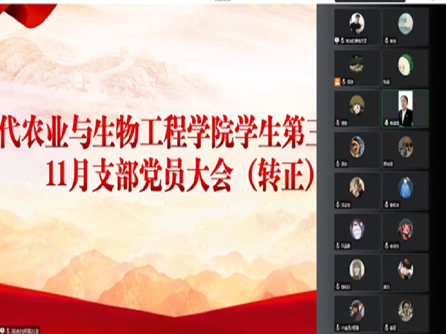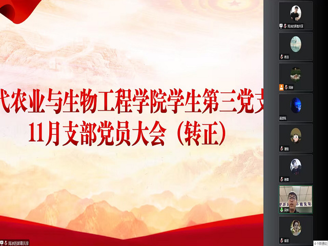 现代农业与生物工程学院学生第三党支部于2022年11月11日14:00,在线上开展2022年秋期第一次党员转正大会。会议由支部书记胡代芳老师主持,本次大会的议题是“讨论预备党员的如期转正问题”。此次党员转正大会由支部书记胡代芳老师主持,我支部共有党员21名,其中正式党员8名,预备党员13名。今天因事请假的党员0人,实到与会党员21人。