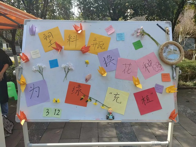 活动伊始,各部门工作井然有序,互相协助。一部分同学画海报,将花种分类包装,其余的同学负责活动的宣传,塑料瓶的收取。领取一粒种子,种下一个希望,路过的同学们都积极上前询问,了解活动内容。随身携带水瓶的同学立即将空闲的塑料瓶置换一袋花种子。也有部分同学特意返回宿舍,将闲置的塑料瓶收集起来进行交换,更有不少的同学当起了“环保小卫士”,旋即在操场周围捡拾遗漏的饮料瓶,既换取到了鲜花种子,也保护了我们共同的校园环境。交换花种子后,同学们还加入群聊,以便于后续分享种子生根发芽的过程,同时也在便利贴上留下了自己想说的话,送给后面的同学,呼吁大家踊跃参与。路过的同学们热情高涨,纷纷响应活动的号召,随着越来越多的人参加,准备的花种子很快被置换完毕。至此,本次活动圆满结束。