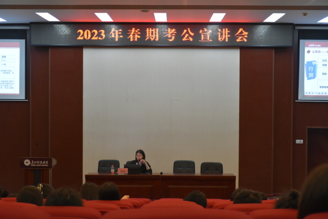 为了给有意向考公的同学们解疑答惑,帮助同学们了解公务员考试专业知识、掌握公务员考试技巧、提高考试能力,长江师范学院现代农业与生物工程学院于2023年4月12日晚上7点在摇光学术报告厅开展了考公宣讲会。本次宣讲会由2020级辅导员汪明训老师主持,中公教育肖茗老师主讲,考公学子参加。