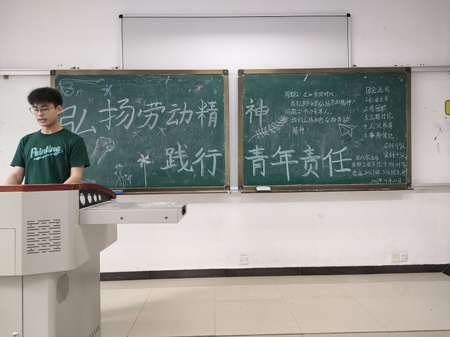 会议伊始,由各班的纪律委员进行点名,接着由文娱委员带领大家合唱团歌,同学们声音嘹亮,充满激情。此后,会议正式开始。紧接着,主持人向同学们介绍每年的五月一日即“五一国际劳动日”,是世界上80多个国家的全国性节日。习近平总书记指出,“社会主义是干出来的,新时代是奋斗出来的。”这就要求广大劳动者要树立正确的劳动观,弘扬劳动精神,坚持苦干实干,把个人的“小我”和国家的“大我”统一起来,把个人成长和时代进步结合起来。牢固树立“一分耕耘,一分收获”的劳动认识,自觉抵制一切不劳而获、投机取巧的错误思想,尊重他人劳动成果,杜绝坐享其成、贪图享乐和无功受禄。身处舞台更大、机遇更多、科技更强的新时代,广大青年大学生只有勤于奋斗、乐于奉献,撸起袖子加油干,才能开创出人生的精彩事业。接着,主持人提出“劳动节的意义”、“什么是劳动精神?”两个问题,同学们积极参与讨论并积极回答。随后,由各班主持人进行人文书籍的推荐。会议的最后,由各班班委进行事物传达。