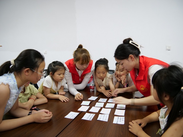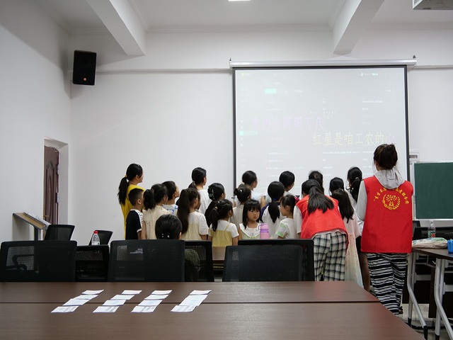 活动之初,由志愿者以讲解和视频两种方式向孩子们介绍了各个革命青年烈士的光荣事迹。课堂上,孩子们也积极举手发言,你一言我一句,一个个英雄故事慢慢浮露出来。在观看改编于肖思远戍边真实事件——微电影《重逢》时,孩子们都被小远奶奶瞒着家人奔波于上海与河南之间,只为替小远安慰女友,送上作为长辈的祝愿的事迹而触动。这样的奶奶是值得所有人敬重的,放眼课堂,一些小朋友和志愿者都不禁落下了感动的泪水,对革命烈士的敬意油然而生。观影结束后,小朋友们在志愿者的引导下,一起同台合唱中国红歌《红星闪闪》、《没有共产党就没有新中国》。随后趣味配对游戏要求每个小组将一张张印有革命青年烈士个人信息和他们的光荣事迹的小卡片正确配对。在小朋友的讨论和志愿者的协助下,每组都顺利完成了课堂小任务,在寓教于乐中熟悉了每位革命烈士的英雄事迹。