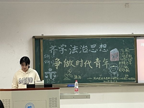 为深入学习党的二十大精神,推进社会主义法治国家建设,引导广大青年团员坚持对党全面依法治国的领导。2023年9月24日,现代农业与生物工程学院于崇礼楼开展以“齐学法治思想,争做时代青年”为主题的团组织生活会。本次团会由各班团支书主讲,现代农业与生物工程学院全体学生参与。