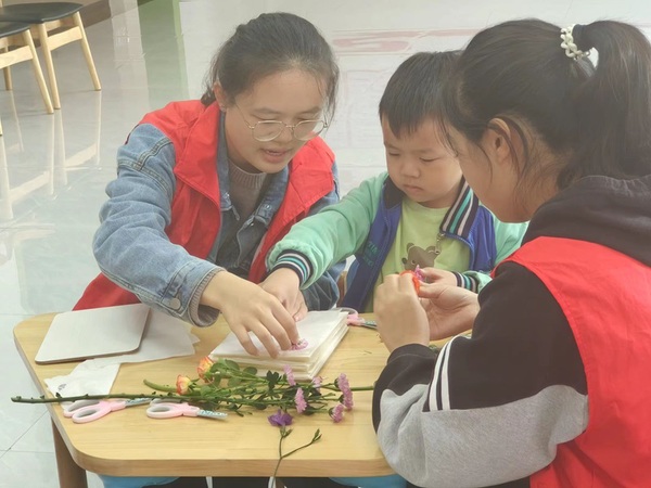 花瓣飘洒心头,温暖洒向万里。志愿者积极发挥专业技能,带领小朋友们亲手制作书签,使小朋友们体验到了创作的乐趣,表达了他们对自然的热爱和尊重,培养了小朋友们的创新能力和环保意识,提升了他们的艺术修养和团队协作能力,同时也展现了当代大学生的志愿服务精神风貌,传递了社会正能量,用寓教于乐的方式,将爱心和关怀传递给小朋友们,有助于营造一个充满关爱、和谐的社会氛围。