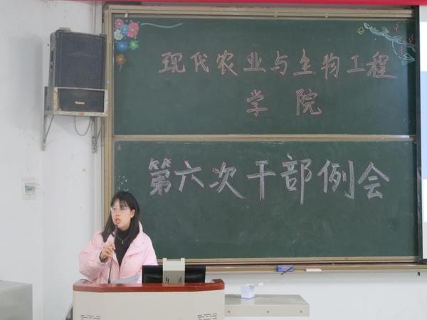 为落实学院各项常规工作,合理规划下周工作,长江师范学院现代农业与生物工程学院于2023年11月21日18:10在格律楼03阶梯教室召开了2023-2024学年第六次干部例会。本次会议由胡代芳老师主讲,学院科技部部长何红艳主持,学生会各部门主要负责人员,21-23级各班三大班委参加。