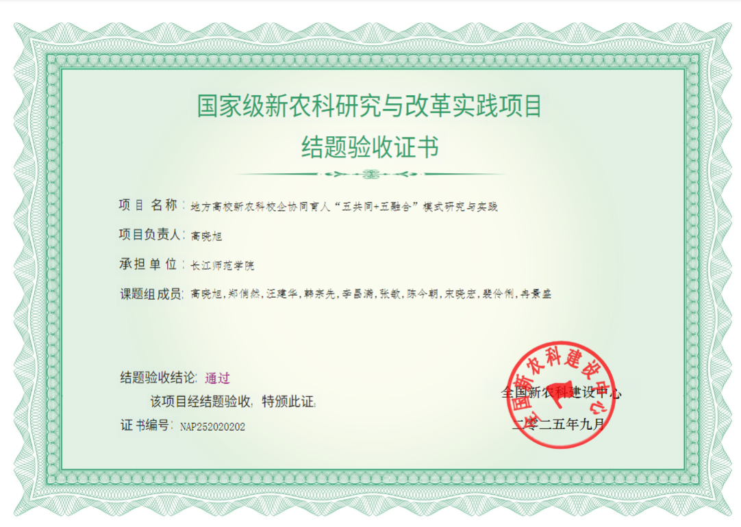 2025916日,教育部办公厅发布《关于公布新农科研究与改革实践项目结题验收结果的通知》,经专家网络评审和会议评审等程序,我院高晓旭教授主持的教育部新农科研究与改革实践项目《地方高校新农科校企协同育人“五共同+五融合”研究与实践》(项目编号:2020202)和宋晓宏博士主持的教育部新农科研究与改革实践项目《地方高校园艺专业“双主体、信息化”教学模式研究与实践》(项目编号2020203)通过结题验收,获得了由全国新农科建设中心颁发的结题验收证书(证书编号:NAP252020202NAP252020203)。该项目的验收通过为现代农业与生物工程学院深入探索新农科改革的新路径,推动高等农林教育创新发展提供重要支撑。