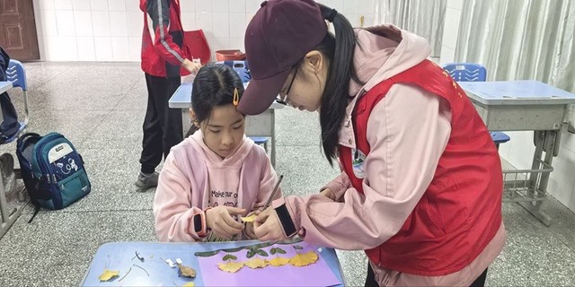 随后,志愿者拿出提前准备的落叶和花朵,陪伴同学们将落叶裁剪粘贴在纸上,制作成一张张充满童趣的贴画,让“变废为宝”的环保理念变得直观可感。