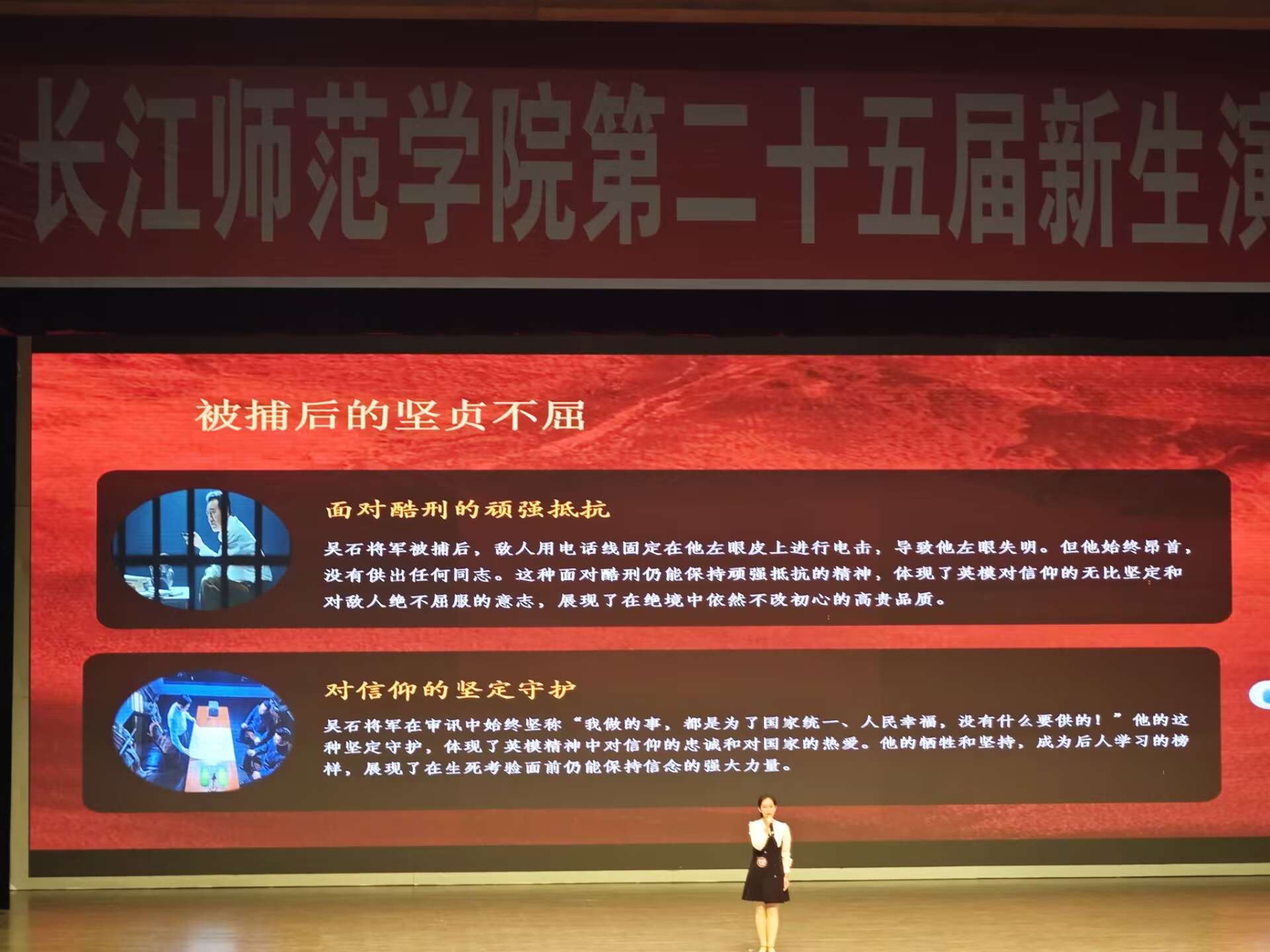 2025年10月29日,长江师范学院“我心中的英模”主题活动在拏云学生活动中心举行。我院的孙竹伶同学以《致敬黎明前的逆行者》为题,深情讲述革命先烈吴石将军的事迹,用信仰的力量打动全场师生,最终荣获二等奖。