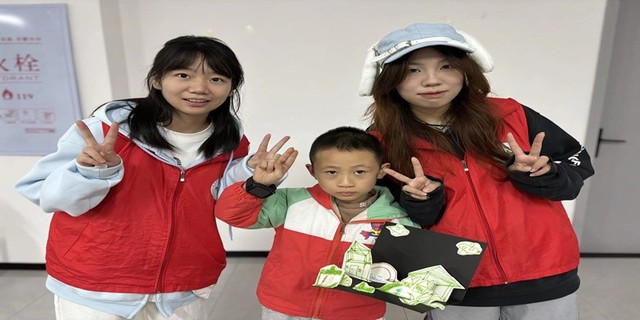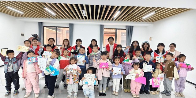 活动中,孩子们在志愿者指导下进行园林手工绘画创作。从绘制、剪裁到粘贴,志愿者们既确保安全操作,又鼓励个性发挥。作品完成后,孩子们开心地分享创意,并拿着自己的作品与志愿者合影。
