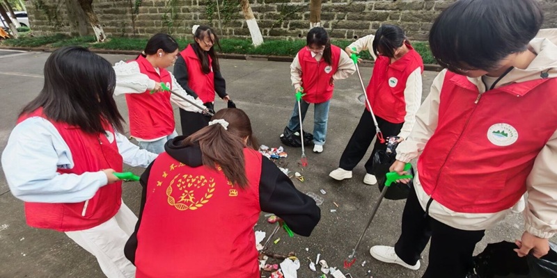 在活动过程中,志愿者们拎着分类垃圾袋,分散在校园操场、林荫道和教学楼周边,用垃圾钳捡拾散落的零食袋、废纸团与塑料瓶,然后仔细分拣。