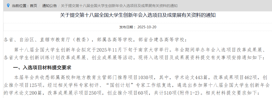 全国大学生创新年会是由教育部高等教育司主办的国家级创新创业教育交流展示平台,集中展现了全国高校大学生创新创业的最高水平,是检验高校人才培养质量与创新能力教育成果的重要窗口。本届年会共遴选出学术论文200篇、改革成果展示项目250项以及创业推介项目60项。