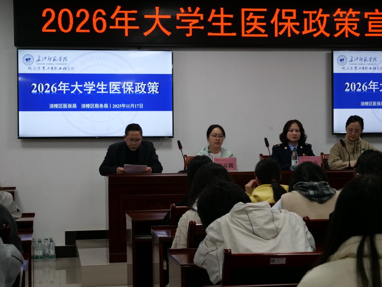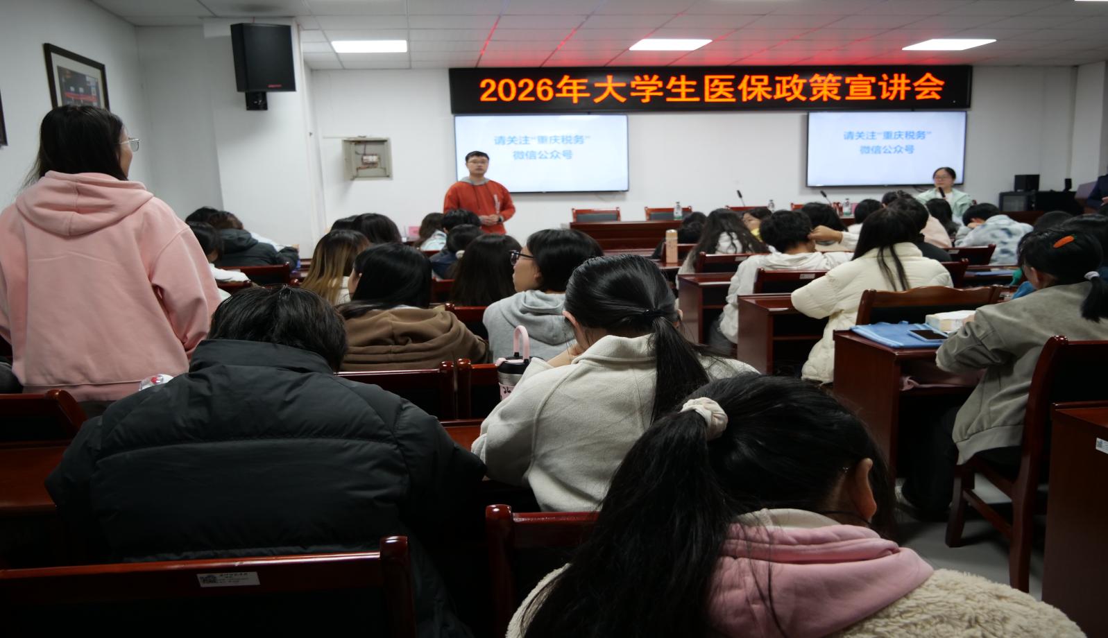 2025年11月17日下午,我院2026年度大学生医保宣讲会在格律楼3101如期举行。本次会议由学院党委书记汪明松主持,来自涪陵区医保局、涪陵区税务局的领导同志为全体学生送上医保政策“干货”与缴费指引。