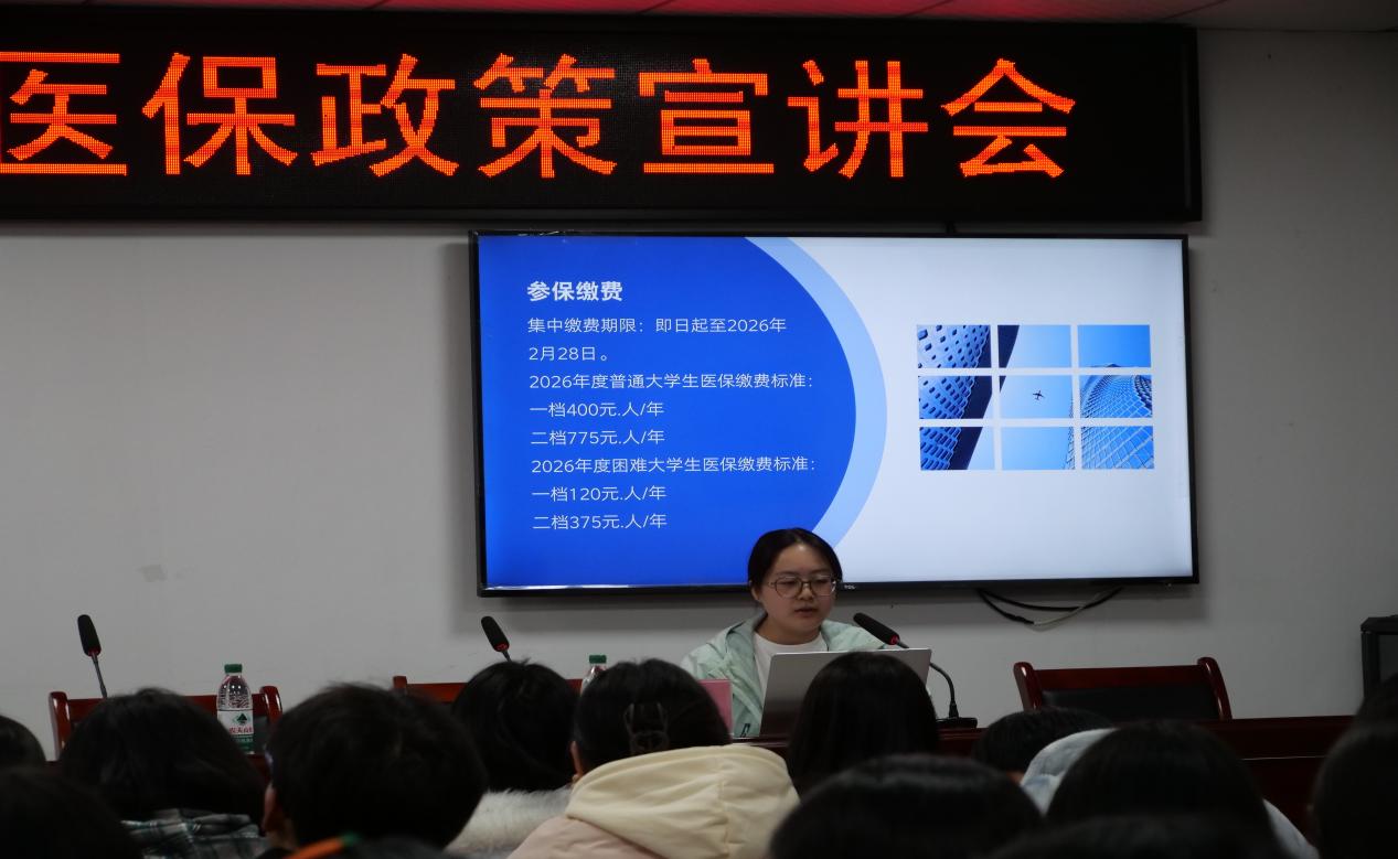 会上,涪陵区医保局刘真毓聚焦2026年度大学生居民医保核心政策,从参保范围、缴费标准、报销比例、待遇享受时间、特殊病种保障、异地就医备案流程等关键内容展开详细说明。重点强调了大学生医保的普惠性优势,明确了门诊、住院医疗费用的报销范围与起付线标准,同时针对学生关注的常见疾病报销、药品目录调整等问题进行针对性解读,帮助学生清晰掌握政策细则。