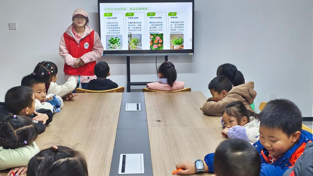 活动中,志愿者结合家居光照特点,用通俗语言为小朋友讲解植物选择技巧,推荐绿萝、吊兰等易存活品种,提醒避开养护难度高的兰花、宝莲灯。通过图文展示与趣味问答,小朋友们快速分清不同环境适配的植物,轻松掌握基础选植知识,埋下爱绿护绿的种子。
