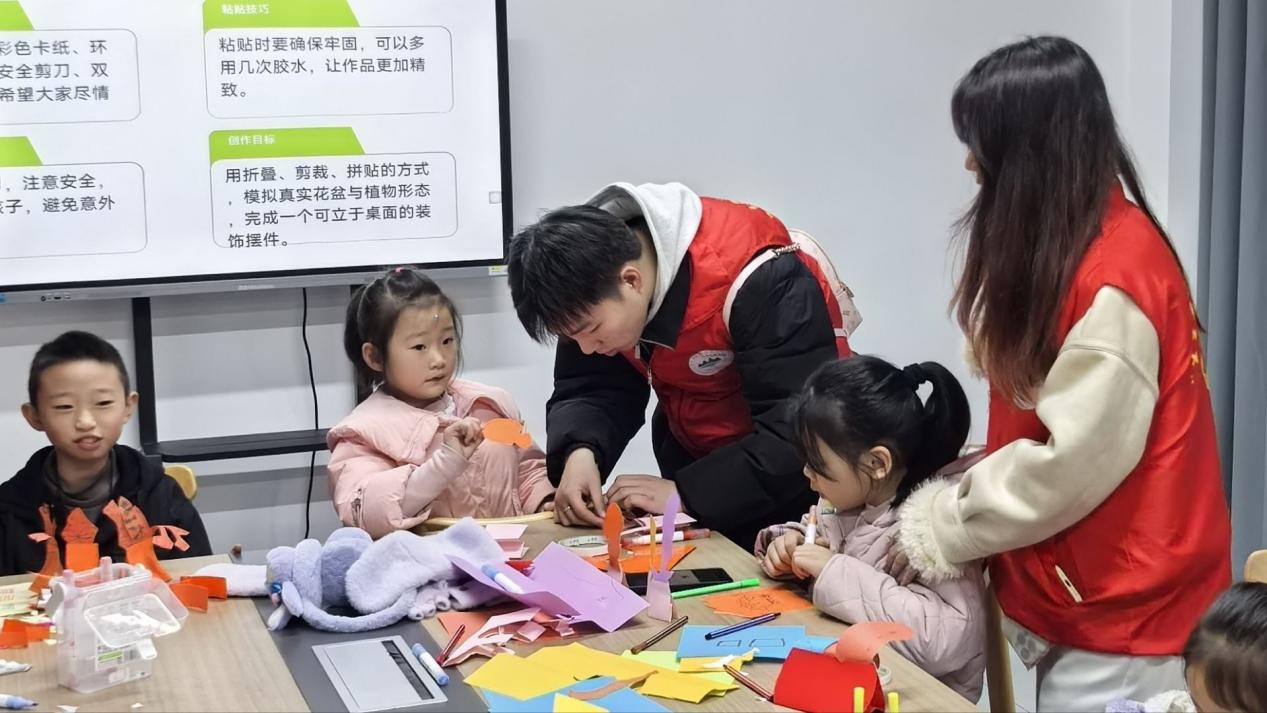 实践中,志愿者为小朋友发放材料,指导卡纸盆栽制作步骤。小朋友们认真剪裁、拼贴,发挥创意勾勒绿植形态,做出各具特色的盆栽摆件。志愿者带领小朋友们探索创意园艺,鼓励小朋友发挥想象,在实践中解锁园艺乐趣与环保理念。