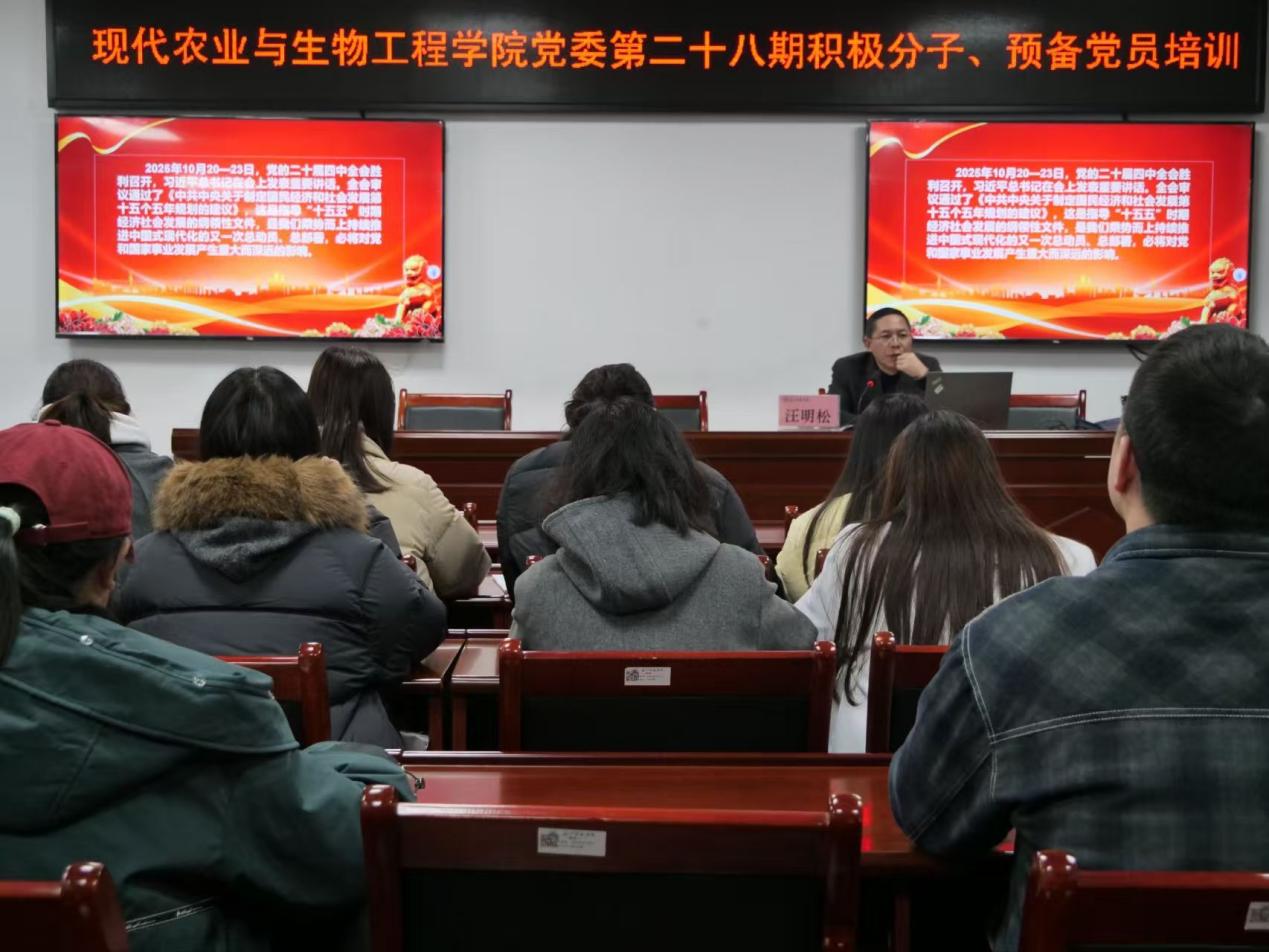 为引导入党积极分子和预备党员深刻领会党的最新理论成果与国家发展战略,我院于2025年11月25日晚在格律楼3101举办了深入学习贯彻党的二十届四中全会精神专题培训会。本次培训会由学院党委书记汪明松主讲,全体入党积极分子以及预备党员参加。